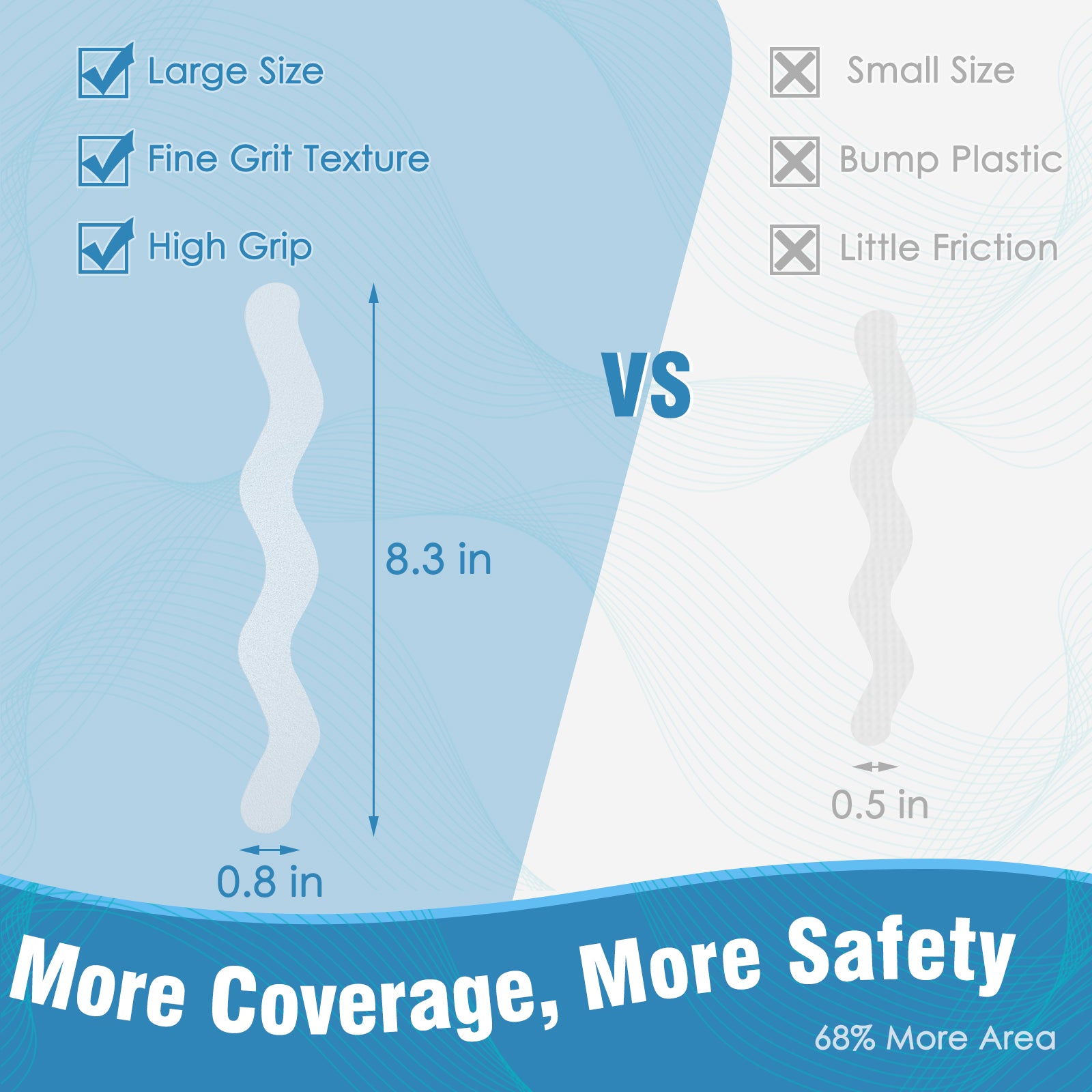 Boost safety in your bathroom with the S&X Clear Anti-Slip Shower Strips. Each strip measures 0.8” x 8” and features a wave-pattern micro-grit surface that provides exceptional traction even in slippery, soapy conditions. Perfect for bathtubs, showers, and other smooth surfaces, these strips help reduce the risk of slips and falls.