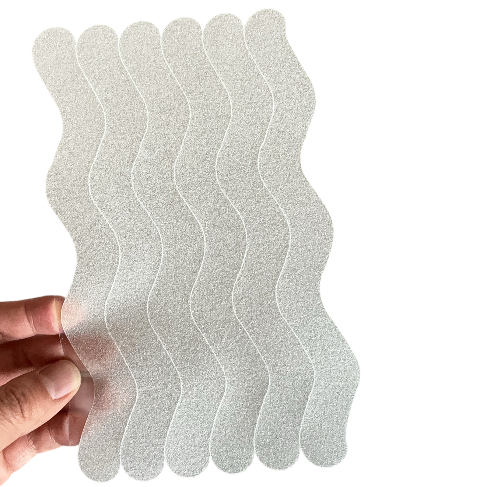 Boost shower and bathtub traction with S&X Clear Wave Anti-Slip Strips. Each strip measures 0.8" × 8" and features a smooth-finish micro-grit surface that balances comfort with confident grip. Compared with common plastic-embossed strips, the wave pattern and refined texture are engineered to help maintain stronger traction in wet, soapy conditions—including areas exposed to shampoo, body wash, shower oils, and soapy water.